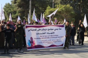 وانتهت المسيرة بترديد شعار “المرأة – الحياة – الحرية”.