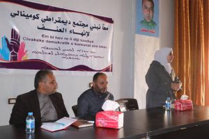 في إطار حملة مناهضة العنف ضد المرأة وبعنوان “معاً سنبني مجتمع ديمقراطي كومينالي لإنهاء العنف ” نظم مجلس تجمع نساء زنوبيا صباح اليوم بتاريخ ٢٢ تشرين الثاني اجتماع موسع حول الحملة من أجل التوعية للنساء والرجال تحتل التوعية مكانة أساسية في الحد من ظاهرة العنف، لأنها تزود المرأة بالمعرفة التي تمكنها من حماية نفسها واتخاذ القرارات المناسبة، شهدت المشاركة من لجنة الحركات النسوية في المجال العسكري والمدني والبعض من الأهالي . أقيم الاجتماع في مجلس العسكري في حزيمة على أرض قاعة أرض قاعة قوات الأمن الداخلي